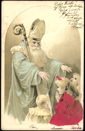 Képeslap 1913-ból. Több változatban is forgalomban volt, így a Mikulás ruhája piros és barna is volt a képen.